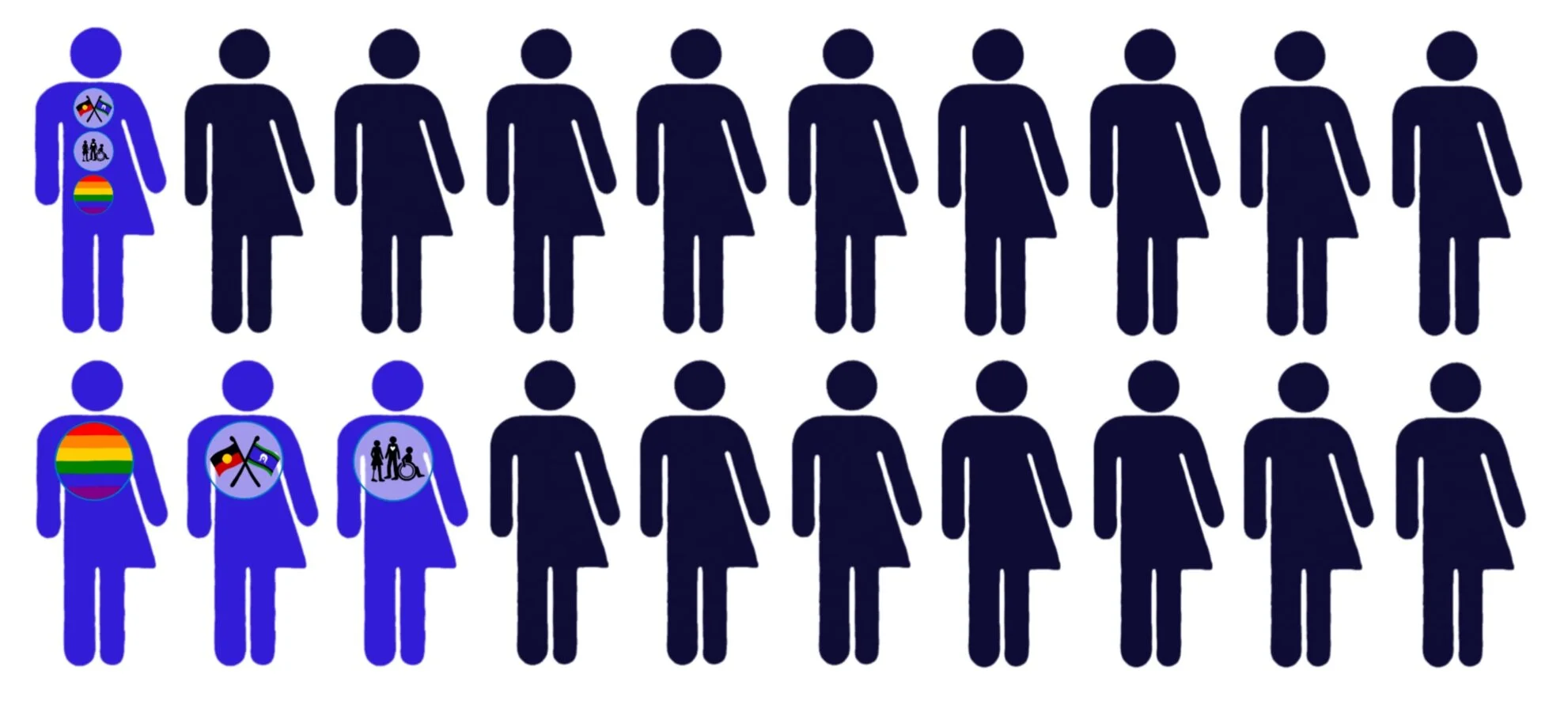 In Australia this group includes women, transgender and non-binary people; members of the LGBTQ+ community; First Nations Australians; culturally and linguistically diverse Australians including people identifying with a non-Christian faith; people living with a disability; younger Australians; people without a tertiary education; and people who were born into or live in relative socio-economic disadvantage.